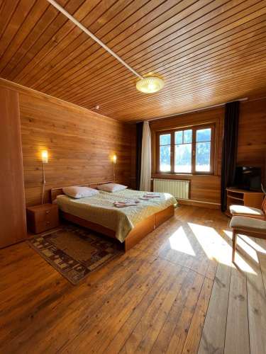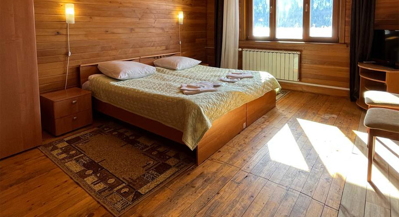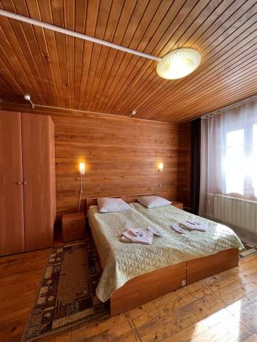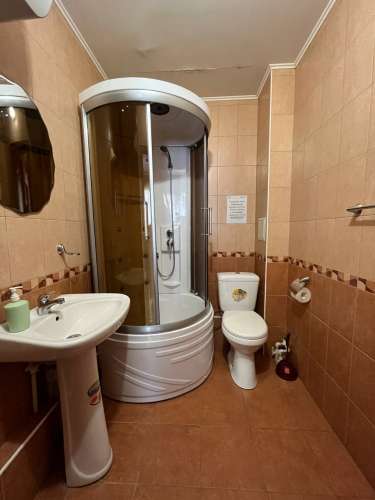В номере две односпальные кровати, две прикроватные тумбочки, два стула, журнальный столик, шкаф для одежды, ТВ с плоским экраном.На два номера общая оборудованная кухня, санузел с душевой кабиной, раковиной, унитазом.