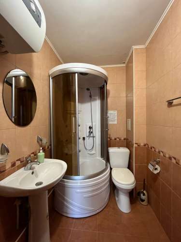 Спальня: двухспальная или две односпальные кровати, две прикроватные тумбочки, два стула, журнальный столик. Санузел с душевой кабиной, раковиной, унитазом.