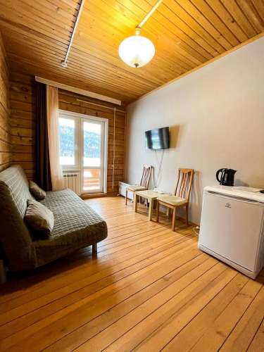 Гостиная: диван раскладной, два стула, журнальный столик, холодильник, чайник электрический, ТВ с плоским экраном.